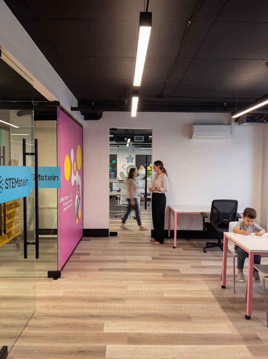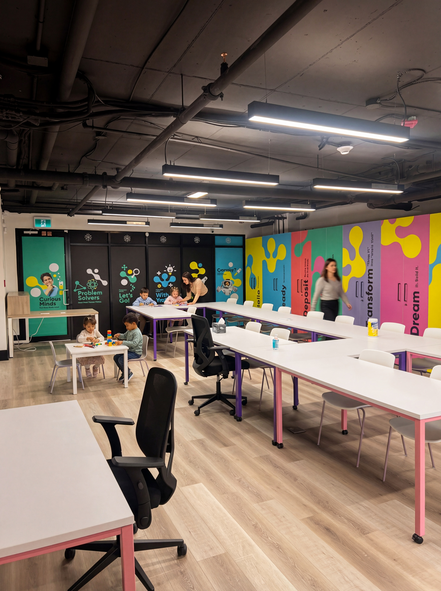 The materiality reflects a balance of professionalism and play. Commercial-grade surfaces—from the custom powder-coated desk frames to the acoustic ceiling treatments—ensure durability for a high-traffic environment. The use of linear, suspended lighting provides a rhythmic overhead logic, drawing the eye through the space and reinforcing the center’s focus on structured discovery and modern innovation.