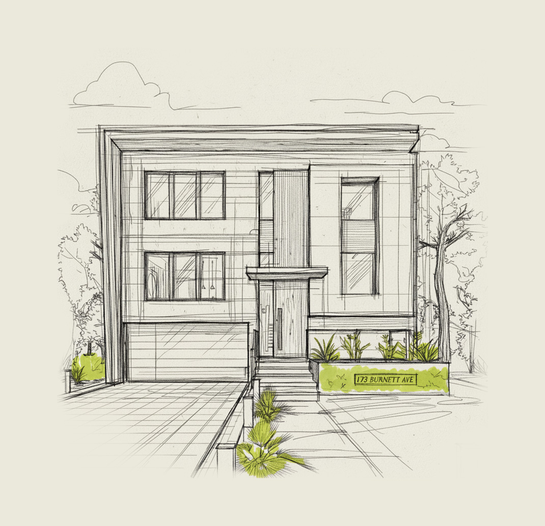 The design for 173 Burnett Avenue embraces a modern, minimalist aesthetic that feels both refined and welcoming. Clean lines and a carefully curated color palette define the home, while the interplay of concrete and dark-toned cladding adds richness, depth, and texture.