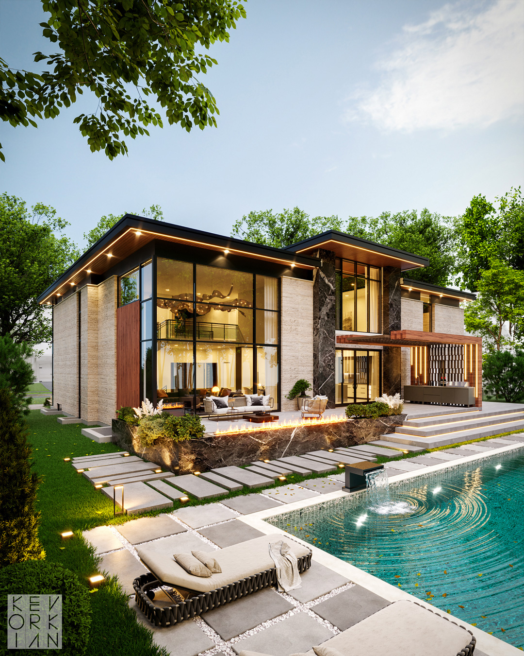 The back side of the house is an expansive, luxurious outdoor living space designed for entertaining, featuring a prominent, two-story expanse of glass that frames the interior views and connects seamlessly to the exterior. The focal point of the tiered backyard is a sleek rectangular swimming pool with a vibrant blue-tiled interior, surrounded by large concrete pavers and a deck with modern lounge chairs. Leading up to the house is a multi-level stone terrace that incorporates a linear fire feature into the retaining wall, alongside a covered outdoor dining or lounge area defined by a wood-slat canopy, all framed by rich landscaping and showcasing the home's high-end mix of stone and wood materials.
