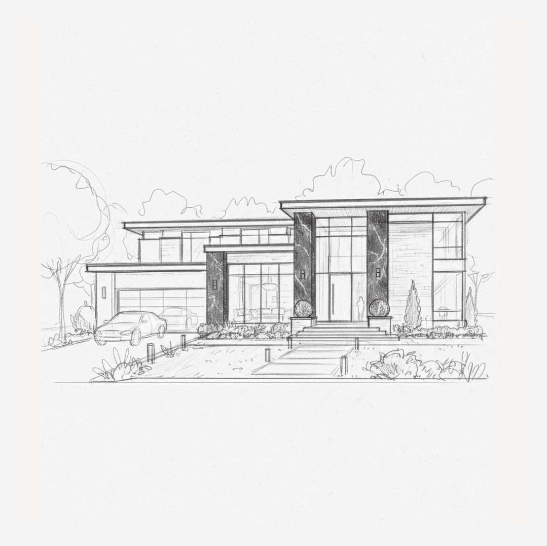 the house design is a modern, minimalist single-family home defined by its strong horizontal and vertical lines. The key concept is one of openness and transparency, achieved through extensive use of full-height glass walls and large windows, particularly across the front façade. It features a flat or low-pitch roof with deep eaves, a prominent two-story entryway flanked by bold, dark vertical columns, and a clean, rectangular massing. The overall idea is to create a sophisticated, light-filled residence that connects with the surrounding landscape while maintaining a sleek, contemporary aesthetic.